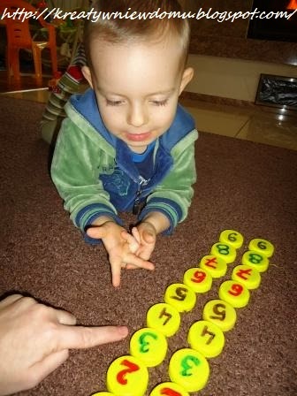 Przygotowałam Kubusiowi nakrętki, na których napisałam cyferki od 0 do 9... po dwie sztuki z każdej cyferki. Przygotowałam mu również nakrętki, na których namalowałam kropeczki... od 1 do 9.