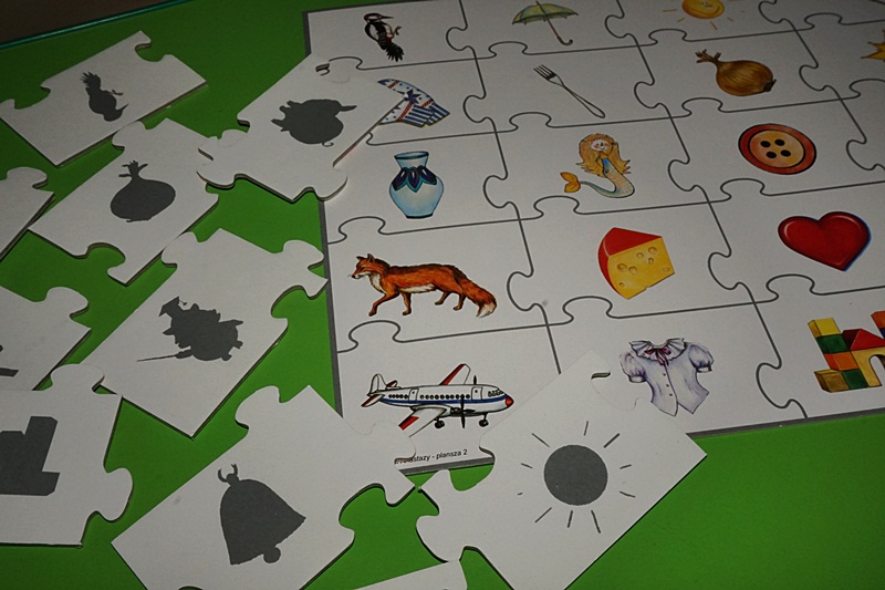 oraz wyrazów jednosylabowych z poznanych liter. Jako, że jesteśmy na etapie nauki czytania to puzzle te idealnie wpasowały się czasowo. Kuba najpierw uzupełniał brakującą samogłoską wyraz, czytał go a dopiero później szukał go na planszy. Odwrotny mechanizm nie przyniósłby zamierzonych efektów, gdyż zamiast samodzielnego czytania wyrazów byłoby ich odgadywanie za pomocą obrazków i porównywanie z puzzlami, zero byłoby w tym czytania.